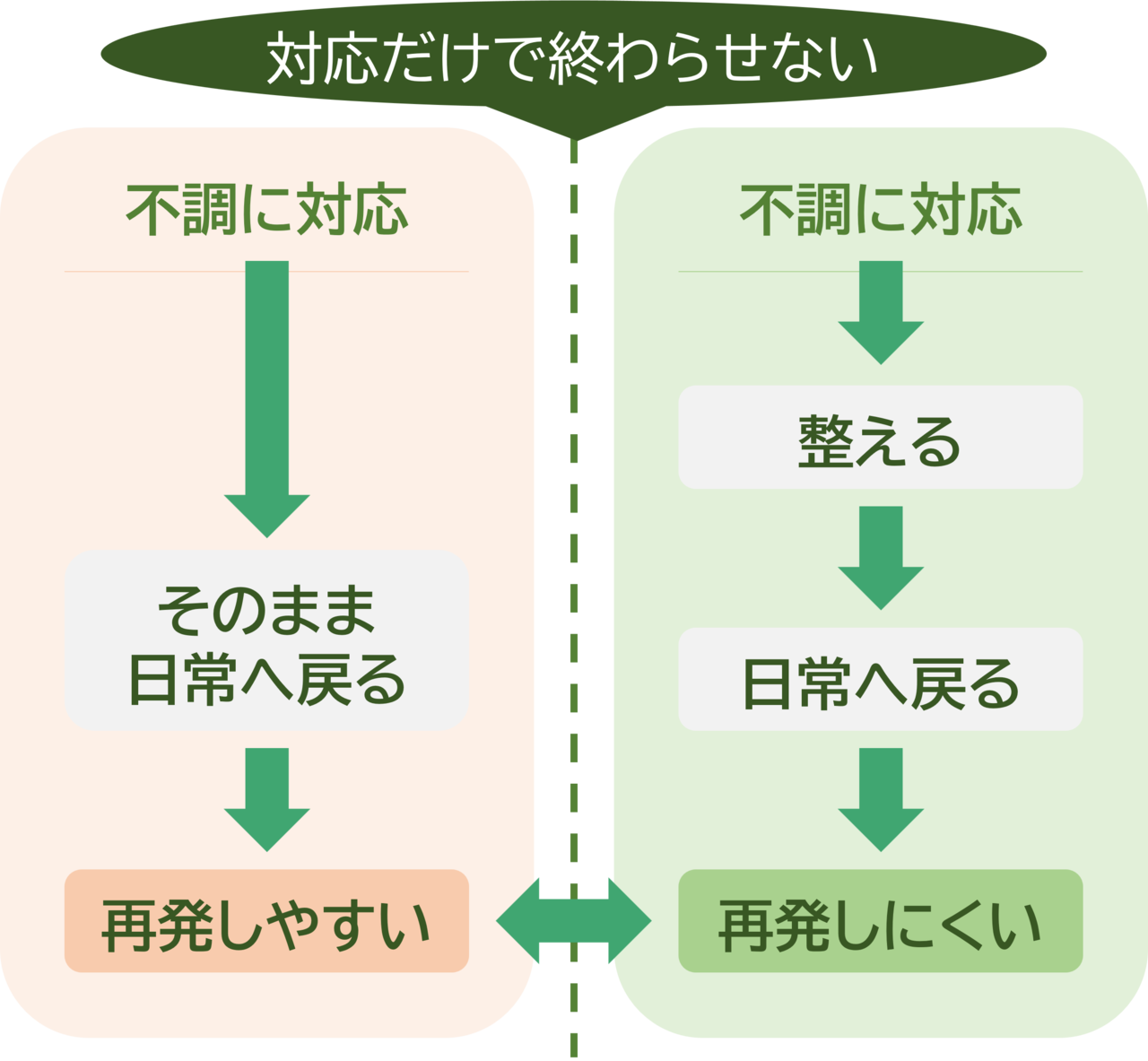 私たちは、不調が出たときに対応するだけでなく、その後に身体の状態を整え、再発しにくく、
